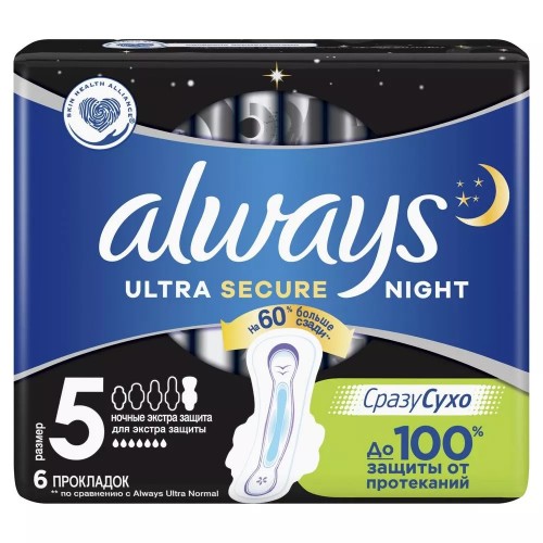 Always Ultra Secure Night с системой InstantDry мгновенно впитывают влагу и удерживают ее внутри, обеспечивая до 100% защиты и уверенности. Оснащены технологией нейтрализации запаха, которая блокирует неприятный запах, а не просто маскирует его. Толщиной всего 3 мм, дарят комфорт и обеспечивают непревзойденную защиту во время менструации. "Always Ultra Secure Night" имеют удлиненную на 60% заднюю часть. Благодаря этому они обеспечивают еще лучшую защиту от протеканий. Созданы специально для защиты в ночное время.