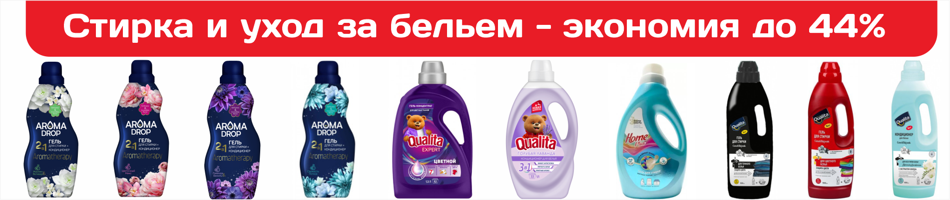Профессиональный уход за вашим гардеробом! Гели для стирки AROMA DROP, Qualita и Home Plus со скидкой до 44%, кондиционеры для белья всех ароматов. Специальные формулы для цветного, темного, белого и детского белья. Ваша одежда заслуживает лучшего!